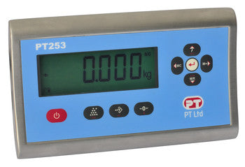 The PT253 is a low cost, high quality general purpose weighing indicator for industry in a durable stainless steel housing. The PT253 is approved by Weights & Measures Authorities for use in Accuracy Class III applications with 6000 and 2x 6000 intervals in accordance with OIML R76. Weighing, Counting, Check weighing and Dynamic Weighing for animals are standard as is printing selectable from five languages. It has 100 memory locations for Average Part Weight for Counting and 100 product memories for check weighing. Under, OK, Over Status bars and programmable buzzer for operator prompting are available for check weighing. Easy and practical operation via navigation keys with two programmable function keys and 25mm high digits and wide viewing angle, multi-colour backlit LCD display. The PT253 can even be configured as a remote display for Azure instruments. The PT253 is powered by AC power and internal re-chargeable Li-ion long life battery. FUNCTIONS